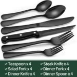 PREMIUM 24-PIECE BLACK SILVERWARE SET FOR 4: This flatware set contains 4 dinner forks, 4 salad forks, 4 dinner spoons, 4 dessert spoons, 4 dinner knives and 4 steak knives. It’s the ideal set for home daily use, and also for restaurants, pubs, cafes, and hotels. This cutlery set also help your dinner full of design while having a party.
