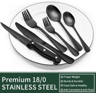 COMFORTABLE DESIGN: This flatware set has a classic silhouette with clean lines and polish-finish surface in all black, a good choice to go with your existing tableware. The smooth edge of the handle is pleasure to hold, appropriate weight and perfect balance are added to ensure maximum comfort during use.